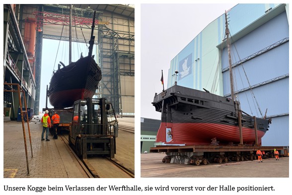 Bereits morgen, am Dienstag um 07:00 Uhr, wird unsere Kogge zunächst aus der Werfthalle gefahren und vor der Halle positioniert. Hintergrund ist, dass der Hallenplatz kurzfristig für ein anderes Schiff benötigt wird.